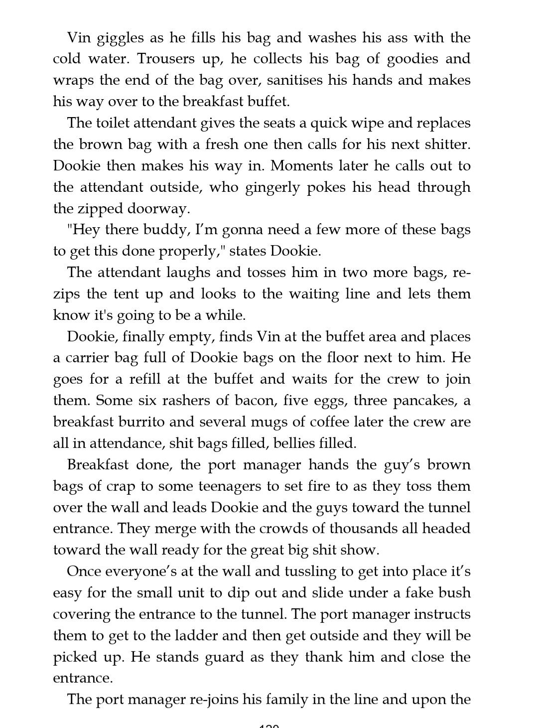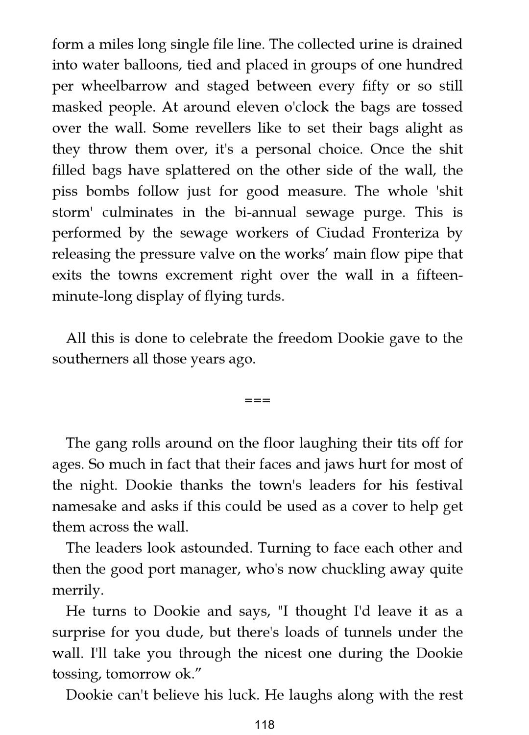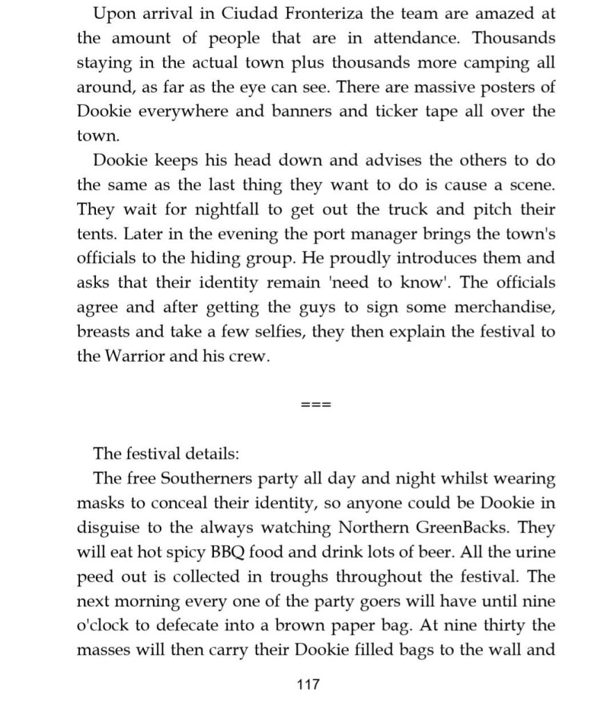 In my novels there is a bi-annual ‘festival of Dookie’ at the southern boarder wall of the North. I’ll attach a few screen shots from the 1st novel as i’m sure that will be more entertaining than me trying to recreate it.
