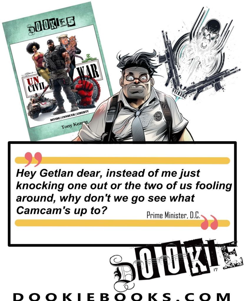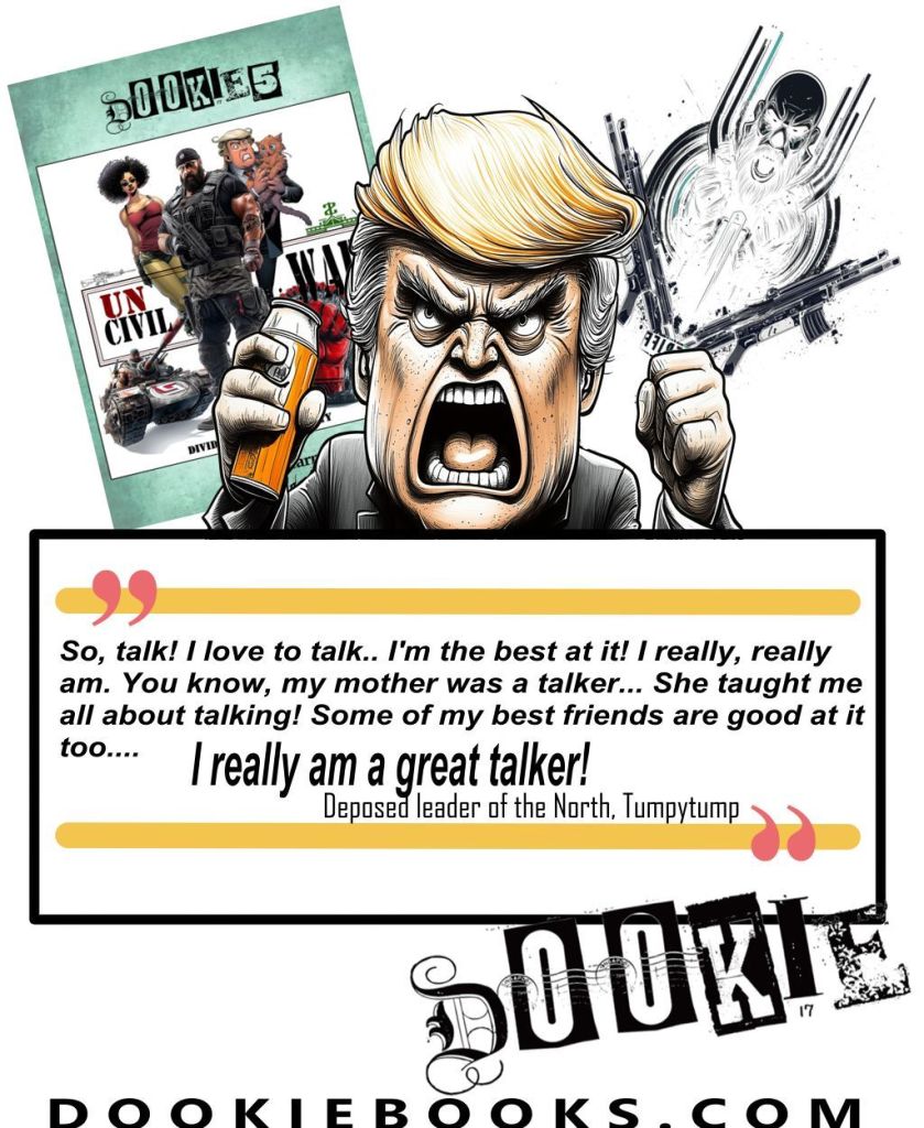I love the ‘couldn’t give a f*ck’ attitude to them all to be quite frank. From battling a rogue corporation and the Pope in Dookie 1, to fighting the axis of evil (Tumpytump, little Kimi and Poostinks) in World War 3, then my take on a Mad Max style scenario in book 3 and of course the guys teaming up with The Hippy Jesus to break into heaven and give God a good ol’ a$$ whooping in book 4. The sky’s the limit!